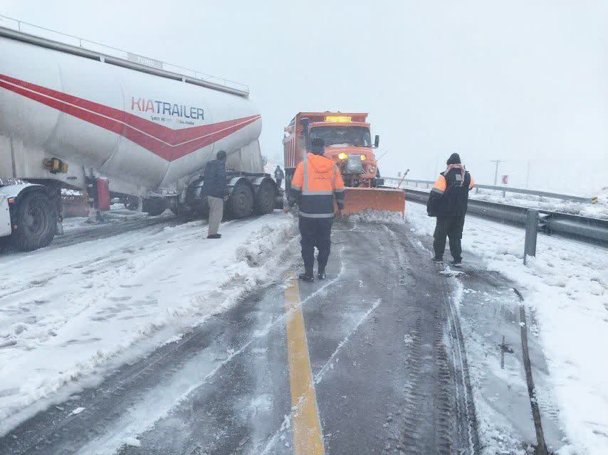 تلاش راهداران زحمت کش بهابادی برای بازگشایی گردنه اسفنگ و آزادسازی این محور جهت تردد کامیونهای عبوری.